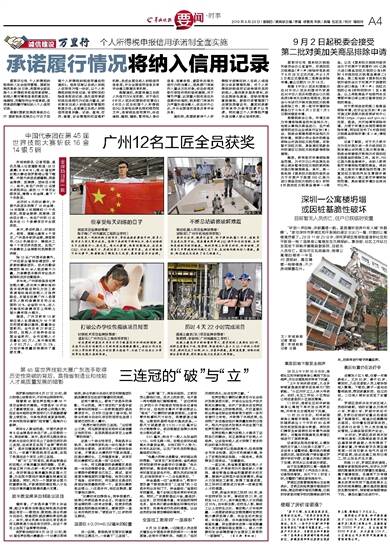 同样令人振奋的是,中国代表团中有8名金牌选手来自广东,占总数的一半,再创新高。其中,选手郑玉辉在综合机械与自动化项目终止了劲旅巴西队的三连冠,在该项目实现了金牌“零的突破”;选手田镇基更是顶住卫冕冠军的压力,一举拿下数控铣项目金牌,实现了我国在这个项目上的三连冠。
