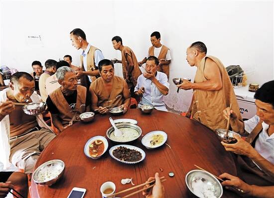 ▲恢复了拉纤旅游项目后,纤夫们每月能有3000多元的收入,生活也改善了不少。中午景区还提供一顿免费午餐,虽然简单,老纤夫们还是吃得很香。