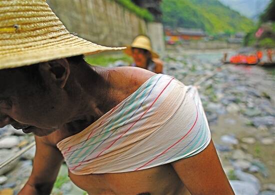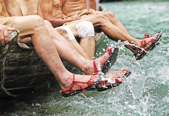 ◀当年拉货船自然比如今拉客船要辛苦得多,但他们也还是一样要穿着草鞋下水,这些草鞋都是纤夫们自己编的。回忆起以前,60岁的老纤夫陈乡坪说:“别人早上起来是穿裤子下地,我们则是脱裤子下水。”