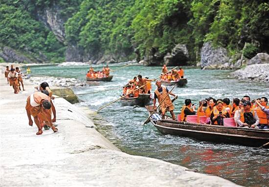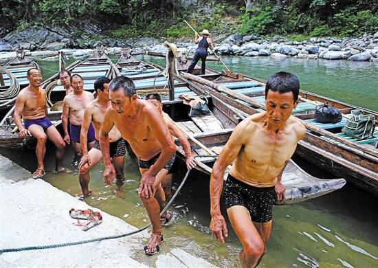 上世纪80年代,神农溪“纤夫拉纤”成为三峡旅游的一道亮丽名片。但2003年三峡蓄水后,昔日峡谷险滩都沉入江底,神农溪部分自然景观不复存在,加上公路交通的发展,纤夫们纷纷“失业下岗”,很多纤夫只能外出打工养家。“纤夫”一景一度消失。直到2014年精准扶贫以来,当地政府把神农溪上游没被淹没的河道进行了清理,又恢复了拉纤旅游项目,“纤夫”才再次出现在神农溪边。