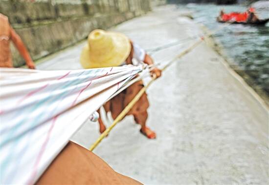 ▶纤夫号子里喊道:“三尺白布,嗨哟!四两麻呀,嗬嗨!脚蹬石头,嗬嗨,手刨沙呀,嗨着,光着身子,嗨哟,往上爬哟,嗨着着……”正是纤夫们真实写照。