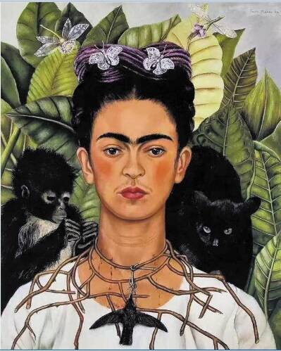 这幅弗里达作品《戴着荆棘项链和蜂鸟的自画像》,就是画展广告