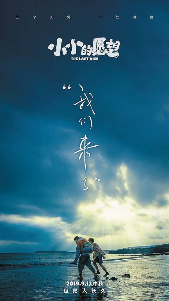 由《前任》系列导演田羽生执导的青春爆笑喜剧《小小的愿望》(原名《伟大的愿望》),近日发布一款“我们来了”海报,并宣布定档9月12日全国公映。海报上,“但愿人长久”的标语与中秋档“月圆人团圆”的氛围不谋而合。画面中,阳光透过层层乌云洒在大海上,泛起淡淡波光。王大陆饰演的徐浩背着彭昱畅饰演的高远,魏大勋饰演的张正阳则帮忙搀扶,三个好兄弟一起叫喊着奔向青春的大海。海报上的“我们来了”既见证了三个宝藏男孩终于完成冲进大海的誓言,也表达了三兄弟为了实现小小的愿望全力以赴勇往直前的精神。