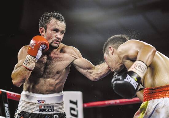 昨晚比赛的重中之重,WBC与IBO亚洲洲际头衔联合腰带赛,由WBA/WBC亚洲超中量级拳王伊力夏提迎战日本超新星丸木凌介。第一回合,双方打得非常谨慎,伊力夏提不断使用前手刺拳试探对手。第二回合,伊力一组组合拳将对手逼至围绳边缘,对手的眉骨被打开,鲜血顷刻而出,视线也因此变得模糊,只得守住抱架防止进一步受伤。现场瞬间陷入沸腾,伊力趁势追击,却因此吃了几记重拳反击。