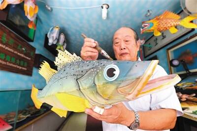最让人叫绝的,是包基勤在制作鱼灯的基础上,又探索出一种“仿真鱼模工艺”。他利用废纸、塑料泡沫等材料替代以往的木料,通过纸张裱糊、涂色、上釉等多道考验工匠手艺精细的工序,让一条条“鱼模”“游到”了盘子里,看上去就像是海鲜菜馆里的菜品,颇能以假乱真。包基勤因此还获得了国家知识产权局颁发的《发明专利证书》。
