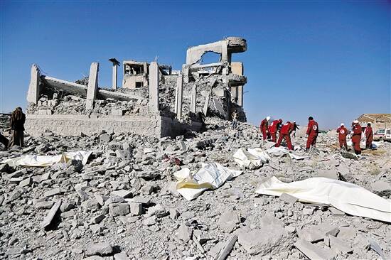 救援人员在遭到空袭的建筑物废墟寻找幸存者 新华社发