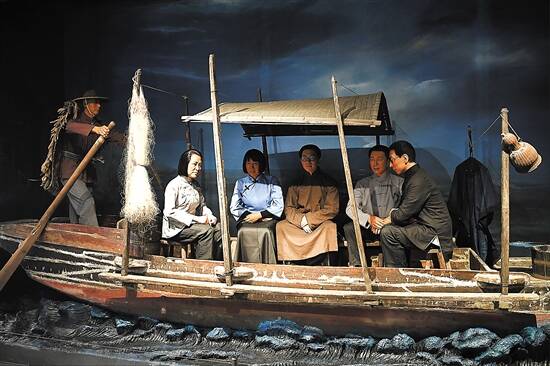 历史场景重现当年小船中的茅盾夫妇横渡九龙红磡的场景