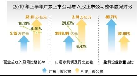 2019年上半年,上市粤企继续较高增长,在营收和净利润增速上双双超过沪深两市整体水平。同花顺iFind数据库统计显示,622家上市粤企上半年实现营业总收入3.32万亿元,营收合计仅次于北京,排在31个省市的第二位,同比增长10.31%,平均每家上市粤企实现营收53.34亿元;实现归属母公司股东净利润合计3598.94亿元,同比增长24.67%,增长率排在31个省市的第四位,平均每家企业盈利5.79亿元。