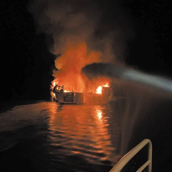 一艘游船当地时间2日凌晨在圣克鲁斯岛附近海域失火并沉没。美国媒体报道说,出事游船是圣巴巴拉县一家公司的3艘大型潜水船之一,核定最大载员46人。失火时船上共有39人,包括5名船员和34名潜水游客,目前仅有5名船员获救。据报道,潜水游客夜间通常在甲板下的客舱休息,船员则睡在甲板上。