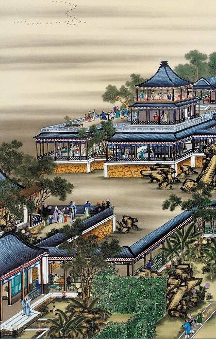 五月,端午节,龙舟竞渡。园林水面上,数十只龙舟奋力前行。雍正帝与手下官员们,坐在二楼高阁里,观舟宴饮,一片欢愉;