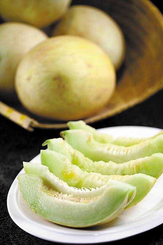 它的当造期很短,只有一个月。由于甜度高,去到八九成熟才采撷,不耐保存,所以只能空运,全程温度要控制在0℃到5℃之间。好的白兰瓜,以瓜皮皱,纹路粗密为上。据大厨介绍,白兰瓜除了生吃,还可以加入蛋清做汤羹,是解秋燥的上选。