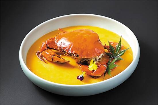 和往年相比,今年的膏蟹品种格外多,因此,如何解锁新的打开方式,也值得大厨们下苦功夫。粤海喜来登酒店的采悦轩中餐厅,近日就以独有的烹调手法炮制了一道“膏蟹蒸芙蓉蛋”。李师傅用的是珠江出海口虎门的膏蟹,配上农家有机鸡蛋。为了保证这道菜的鲜味,师傅以鲜蟹汤替代水,实现了蒸蛋汤底的零水分添加,并将蒸腾的时间严格控制在8分钟。在大火的蒸腾下,膏蟹的鲜味淋漓尽致地融入到蛋液中。整道菜看似平常,却极其考验大厨的功力与火候。