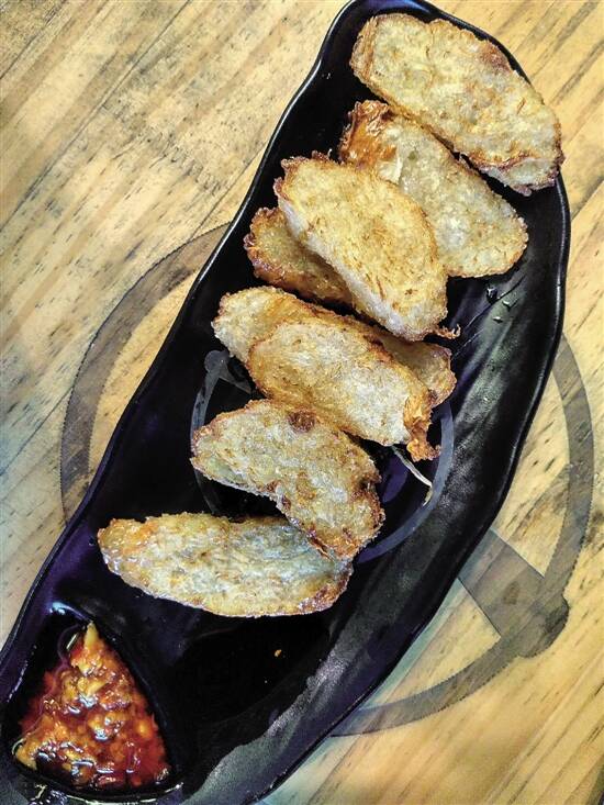 将蒸好的白萝卜糕切成片状,放入热油中炸至金黄,可以更加直观地看到外酥里嫩的分层。先夹一片,感受不蘸酱的原口味,软糯的粿肉夹有白萝卜的清甜香气;而蘸了蒜头甜辣酱的糕片,则有淡淡的甜辣味儿。