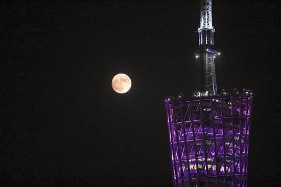 中秋夜,一轮满月与广州塔相映成趣 羊城晚报记者 梁怿韬 摄