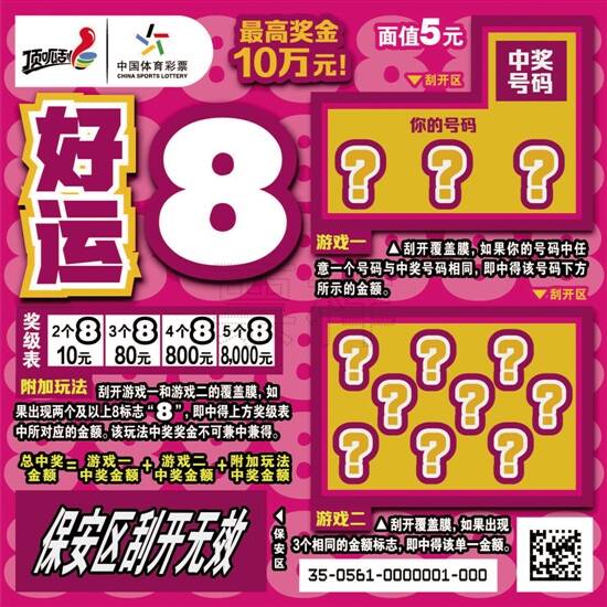 羊城晚报记者从国家体彩中心获悉,目前,即开型体育彩票顶呱刮“好运8”正在全国各地陆续上市销售。该票是数字类主题游戏,单票面值5元,头奖10万元。“晚晚好彩”提醒广东省内的广大即开彩爱好者,近期可去省内实体投注站尝尝鲜。