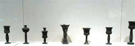 图二 龙山类型黑陶曲卮一组,年代盖为夏朝,夏朝尚黑 摄于山东省博物馆