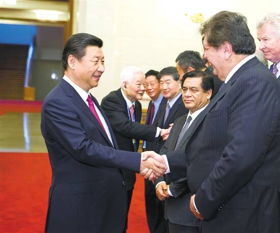 ◀2014年9月24日,国家主席习近平会见出席纪念孔子诞辰2565周年国际学术研讨会暨国际儒学联合会第五届会员大会开幕会的部分外宾和国际儒学联合会负责人。叶选平同志参加会见 新华社发