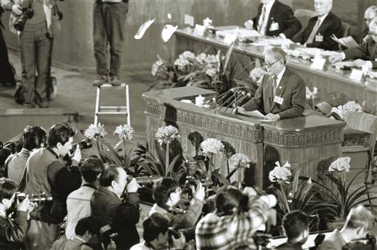 1995年3月3日,全国政协八届三次会议在北京人民大会堂隆重开幕。叶选平同志作政协第八届全国委员会常务委员会工作报告 新华社发
