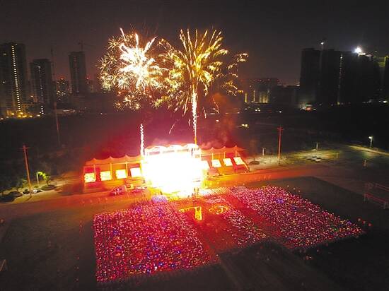 博罗县广场舞排舞协会第三届展演活动中,舞者们在东山森林公园北广场摆出70字样,为新中国庆祝生日 博罗县广播电视台供图