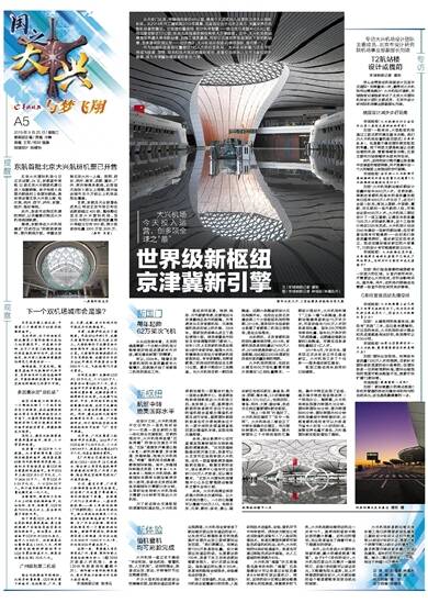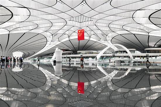 从天安门出发,中轴线向南约46公里,便是今天正式投入运营的北京大兴国际机场。从2014年开工建设到2019年揭幕,这座选址位于北京正南方、京冀交界处的新机场备受瞩目。它地理位置独特、设计科学智慧——距北京行政副中心54公里、河北雄安新区55公里;机场五条指廊放射结构极大方便旅客。此外,大兴机场航站楼是世界最大单体航站楼,且施工难度最高,同时它还是世界首座高铁下穿的航站楼,全球首创双层出发……初步统计,大兴机场共创造40余项国际、国内第一。