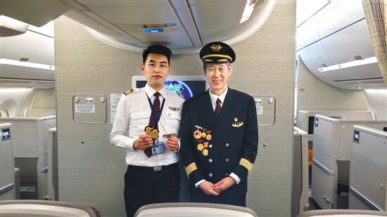 谢远征将他的四道杠肩章和五星机长徽章传给年轻的副驾驶