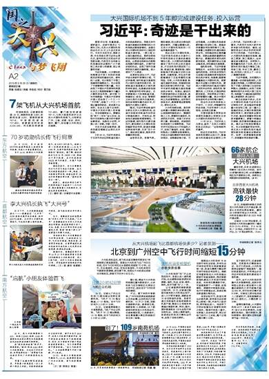 25日,在大兴机场登机口A01,南航CZ3001航班,A380尾翼绚烂绽放的木棉花与凤凰展翅金光灿灿的航站楼交相辉映。在“我和我的祖国”歌声中,旅客登机。“激动!乘坐A380参加大兴机场首航,见证这个历史时刻,非常值得纪念!”经常搭飞机往返北京和广州的旅客张先生说。