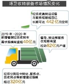 华创证券分析表示,垃圾收集转运设备与服务短期超百亿元,长期可达442亿元。2019年-2020年新增餐厨垃圾收转车需求规模有望超40亿元,垃圾分类后中转站、服务点、回收网点等新增建设规模有望超过320亿元,而督导、转运等服务在短期有望拉动82亿元产值。