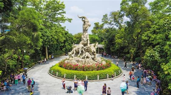 越秀公园的五羊雕像是广州的象征。相传古时,五位仙人,骑五色羊,羊衔谷穗,降临人间,仙人把谷穗赠予百姓,祝福此地五谷丰登,永无饥荒。仙人飘然而去,留下五羊化为石头,广州因此有了“羊城”“穗城”的别称。