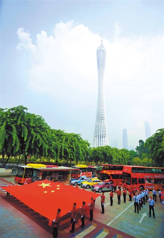 26日上午,“我和国旗同框——广州市公交车出租车万车挂国旗迎国庆”活动在珠江帝景苑公交总站启动(上图,汤铭明 摄)。国庆假期广州市中心区800多条公交线路约1.16万台公交车、3万多辆出租汽车(含巡游车和网约车)都将在醒目位置粘贴和摆放五星红旗,使得广州城市的流动风景线处处洋溢“中国红”。