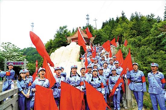 重走长征路活动中“红军队伍”在油山革命纪念碑广场唱响《我和我的祖国》