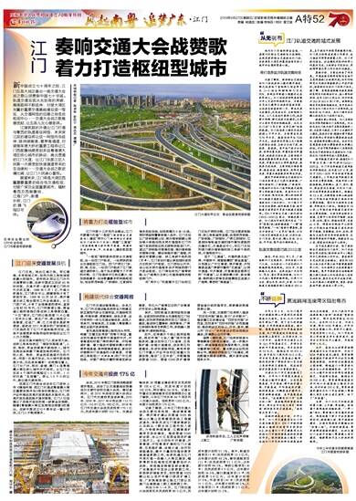 新中国成立七十周年之际,江门五邑大地正奏出一曲交通大会战之歌以颂赞新中国七十华诞。轨道交通实现从无到有的突破,高速路网不断延伸,对接大湾区东翼的重要交通基础建设逐一落实,从交通网络的边陲之地变成枢纽中心……交通大会战之歌高潮迭起,让五邑儿女心潮澎湃。江湛铁路的开通让江门打通与粤西的轨道客运网络,未来深江段的建设将让这一网络向东延伸;银洲湖高速、黄茅海通道,对接港珠澳大桥的重要工程将让江门西部腹地感受到来自粤港澳大湾区核心城市的脉动;南北贯通的江门大道,让江门东部三区人民第一次感受到快速通道带来的生活便利……交通大会战之歌波澜壮阔,让江门人民满心喜悦。