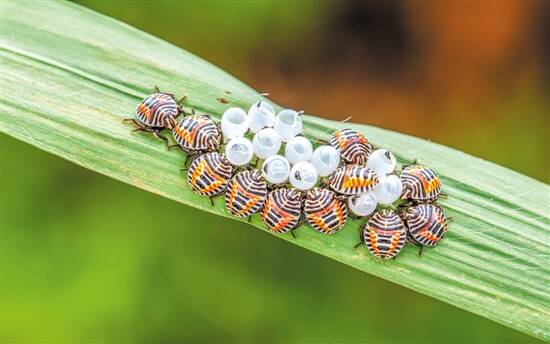 麻皮蝽的卵,呈灰白色,圆柱状,顶端有盖。当卵孵化成若虫,它们就像个新娘一样,自己掀开盖头,来到这新鲜的世界。不过,率先孵化的麻皮蝽若虫并不急于离开,而是继续聚集在一起。一般情况下,这种聚集还会持续两三日,然后,才会散开,开启各自的虫生。