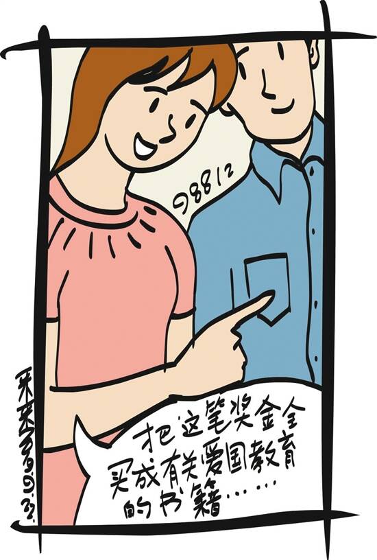 终于有一天,胡秀娥买的彩票中了3000元,周爱国建议她用这笔奖金给自己买辆电动车,但胡秀娥和周爱国商量,把这笔奖金全买成有关爱国教育的书籍,捐给村里的小学,“让孩子们读了更爱国,怎么样?“周爱国听了频频点头,开心地说道:“太好了!我们明天就去书店。”(尚庆海)