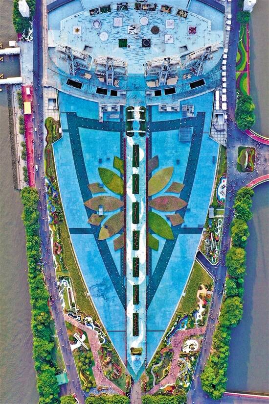 在海心沙举办的第26届广州园林博览会上,由水面景观组成一朵绽放的花朵