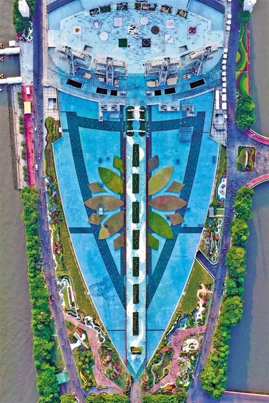 在海心沙举办的第26届广州园林博览会上,由水面景观组成一朵绽放的花朵