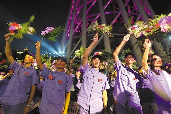 在广州庆祝中华人民共和国成立70周年文艺晚会上,观众挥舞鲜花