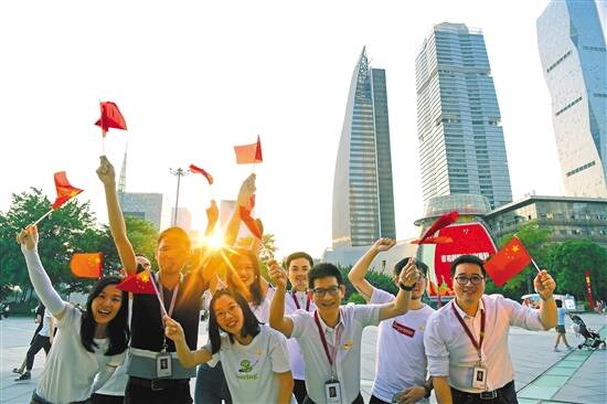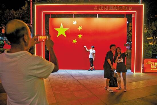 国庆临近,青年在广州新的“城市客厅”花城广场向祖国祝福 羊城晚报记者 邓勃 摄