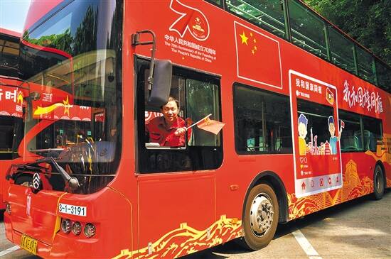 “我和国旗同框——广州市公交车出租车万车挂国旗迎国庆”活动在海珠区珠江帝景苑公交总站正式启动 羊城晚报记者 汤铭明 摄