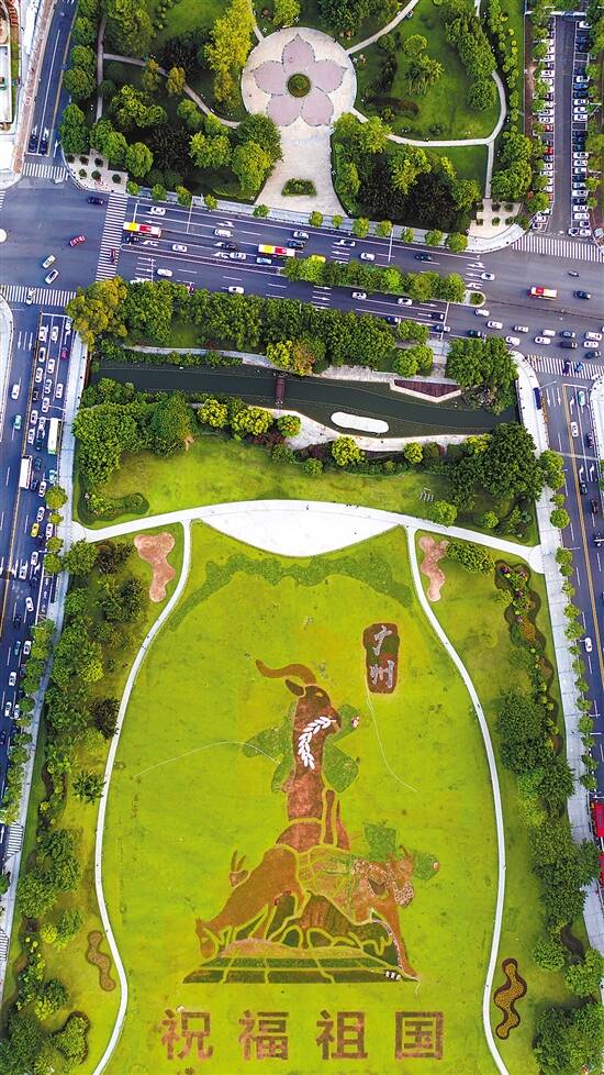 广州塔南广场草坪上做成五羊雕像图案和“祝福祖国”字样 羊城晚报记者 林桂炎 摄