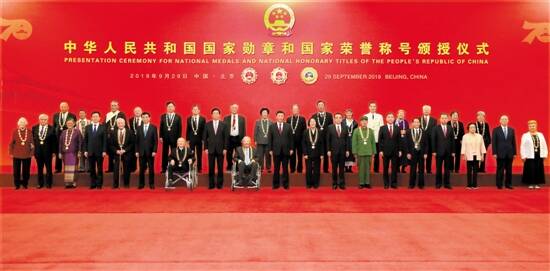 29日,中华人民共和国国家勋章和国家荣誉称号颁授仪式在北京人民大会堂金色大厅隆重举行。习近平等党和国家领导人同国家勋章和国家荣誉称号获得者合影 新华社发