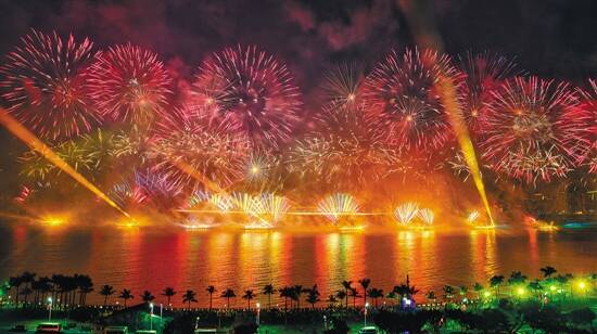 焰火秀第一篇章《中国心——波澜壮阔创伟业》中,“五角星”造型焰火闪耀夜空。第二篇章《湾区情——唇齿相依携手行》以花蕊、蝴蝶、花朵等浪漫造型为主,歌颂珠澳情谊。第三篇章《人民赞——不忘初心向未来》不仅采用了具备多种变化方式的烟花,还穿插特殊造型的礼花燃放,为祖国生日献礼。