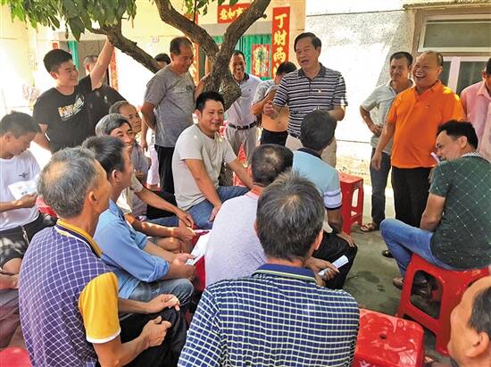 羊城晚报讯 记者周聪、通讯员廉轩摄影报道:一圈小板凳、几句心里话,这就是广东省廉江市群众眼中的“板凳讲座”。在廉江市石岭镇苏茅角村一隅的树荫下,石岭镇委书记林良友隔三岔五就会端着小板凳,坐到人群中侃侃而谈,大到国家战略方针,小到家常邻里琐事。在这里,邻里居民可以畅所欲言,党员干部也能面对面地答疑解惑。