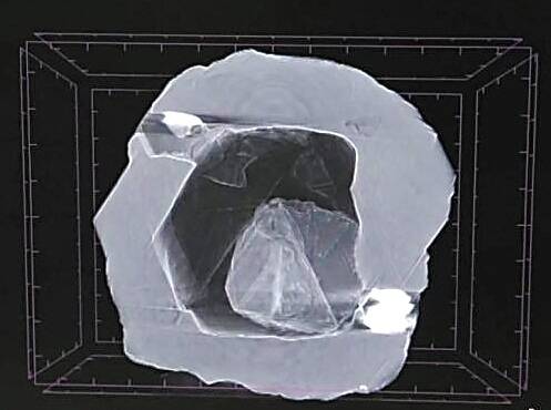 钻石专家们通过多种方法对其进行了研究,包括拉曼光谱(Raman)和红外光谱法,以及X射线显微断层扫描。借助X光可以清晰地看到,这颗钻石的内部其实还嵌套着一颗小钻,它甚至可以自由地动来动去。专家估计,里面这颗小钻重约0.02克拉(约0.004克)。