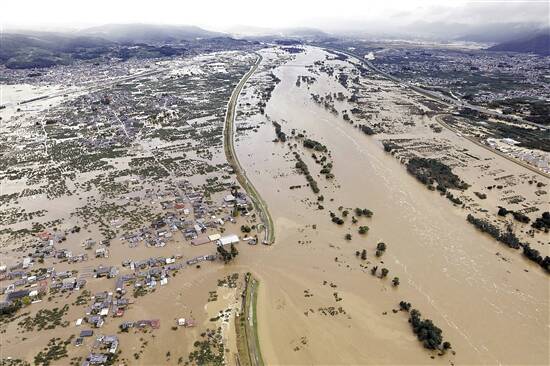 长野县航拍的被洪水围困的住宅区 新华社发