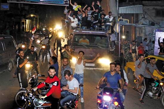 叙利亚电视台13日晚播出电视画面,显示北部哈塞克镇居民走上街头,庆祝库尔德武装和政府军联手(下图,新华社发)。