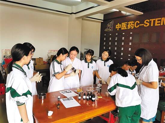 校长周丽红介绍,学校根据所处的地理区位条件,以项目化学习作为学习策略,融合草药、物理、化学、生物、技术与工程课程领域知识,开发出“功能性日化用品配制与产生”中医药C-STEM项目,是国家课程校本化的有益尝试。学校建成了两个STEM教室,其中有创客实验室、中医药C—STEM实验室。