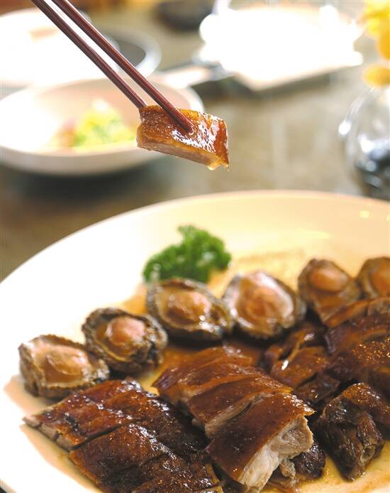 压轴的“古法陈皮鲍鱼烧鹅”也不能小看,梁师傅将八角、桂皮、茴香、香叶、甘草、香果、花椒、姜、陈皮、干沙姜片等多种食材磨成粉,制成酱料,再把完整的鲍鱼和酱料填入鹅肚腌制入味,最后放进炉中烤制。如此一来,新鲜出炉的鲍鱼与烧鹅形成了你中有我、我中有你的和谐双重奏。鲍鱼肉质肥嫩,烧鹅滋味醇厚,二者的肉香味中均夹杂着一点陈皮的香味。