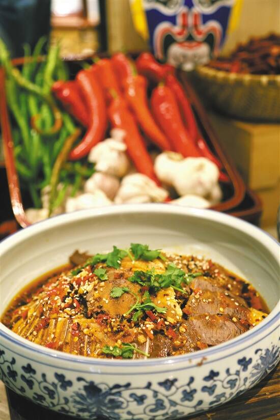川菜中的水煮鱼有着“麻上头,辣过瘾”的特点。美食节期间,冉师傅也呈现了一道现做水煮鱼,满足川辣爱好者的口福。鲈鱼肉滑嫩少刺,用来做水煮鱼再合适不过了。双刀片鱼肉厚薄均匀,即使在辣汤和滚油之下也能保持形状完好。水煮鱼的汤底无疑是灵魂之所在,冉师傅提前以牛骨、鸡架和鱼骨小火慢炖熬制高汤,再加入煸炒的香料,鲜香麻辣的汤底就此完成。在汤底中快速汆熟鲈鱼,捞起放入碗中再淋上一勺滚烫的油,激发香料的馥郁香气,一碗鲜香味美的水煮鱼便完成了。