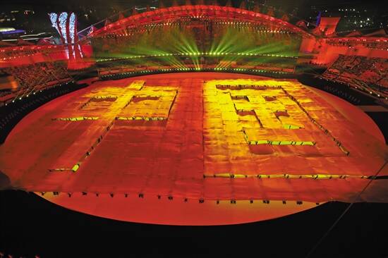 第七届世界军人运动会开幕式现场展示的“中国”两字。和平鸽、和平之火等元素传递了博爱、团结、宽容、友谊的信息 新华社发
