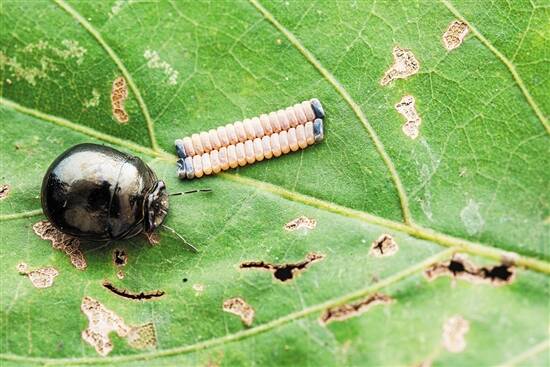 九月的某一天,一只龟蝽,在一片叶子上,产卵。龟蝽是二代生昆虫,春天是它们的繁殖季,秋天也是。不冷不热的天气,正适合卵的孵化和若虫的成长。有趣的是卵的形状,呈两排纵队,整齐划一,从不乱阵脚。不像有的昆虫,“哗啦啦”产下一堆卵来,天女散花般。龟蝽一定是有艺术情怀的昆虫,产下的卵,也如此工整,像一件艺术品。这只龟蝽,在差不多半个小时之中,一口气产下了34枚卵(图一)。它算是龟蝽界的英雄母亲,因为,龟蝽产卵,一般在10到30枚。显然,它是不一般的龟蝽。